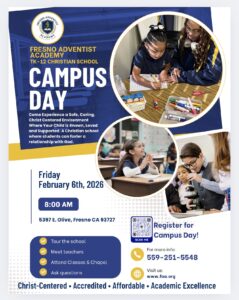 Fresno Adventist Academy will be having a Campus Day, on February 6, 8am, with registration beginning at 7:45 am. Fresno Adventist Academy is an accredited Christian K-12 school in Fresno that promotes academic excellence and spiritual growth. This is a wonderful opportunity for prospective families and students to visit the campus, meet faculty/staff, participate in chapel and the classroom setting, and interact with potential classmates. They look forward to meeting you and your family.
