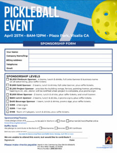 This contest brings together players for a day of high-energy competition, camaraderie, and community spirit, connecting with HNC’s invaluable mission of providing resources to the underserved in Tulare, Kings and lower Fresno counties. Proceeds from this event will directly support projects such as yardwork, home repairs, transportation, appliance repairs, and much more for seniors, veterans, single parents, the disabled and those less fortunate. Every serve, rally, and point played support the stories that connect us all. To become a Sponsor, download the form below and mail it with a check. You can also pay online; under Fund, select Pickleball. |