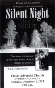 Violinist Jamie Jorge will be in concert at the Clovis SDA Church (located at 2370 Helm Ave. Clovis, Ca 93612) on Monday, December 1, at 7:00 p.m. This is a free Christmas concert and open to the community.