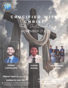 You’re invited to a weekend of revival at the Exeter Seventh-day Adventist church, Friday and Saturday, November 21 & 22. The theme is Full Surrender – Crucified With Christ, and will feature speakers Sonny Capolupo and Jason Rojas. Music will be provided by MDC Praise. It begins Friday evening at 6pm and continues Saturday morning at 10:45am with music, food , and fellowship throughout the day. Lunch and evening snacks will be provided, and everything is free.
