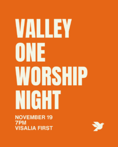 Come out to Visalia First, on Wednesday, November 19, at 7pm, to be energized and uplifted with praise and worship. Visalia’s own Valley One Worship will bless you with classics you know and love and original music they wrote.